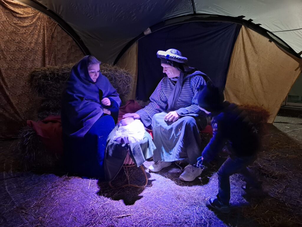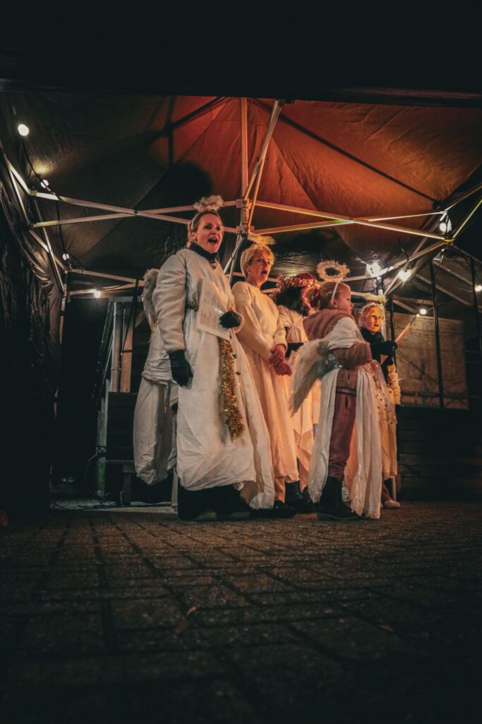 Bezoekers werden buiten ontvangen door een engelenkoor, wat meteen zorgde voor een feestelijke sfeer. Naast het engelenkoor was de herberg en werden mensen verwelkomd door de herbergier (die mededeelde dat de herberg vol zat ;-)), maar dat er nog wel plek was om even op te warmen met warme chocolademelk of glühwein. Een van de blikvangers op het plein was de levende kerststal. In de kribbe lag een echte baby, die heerlijk rustig lag te slapen.