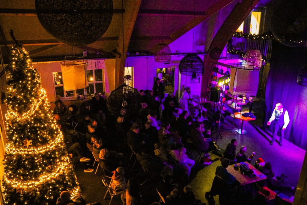 Om 18.00 en 19.00 uur waren er twee rondes kerstvertellingen. In twee volle zalen vertelde verhalenverteller Eric Borrias twee verhalen: over de sterrenpoetser en over de herders. De zaal zat ademloos te luisteren, zelfs de kleinste kinderen zaten meer dan 40 minuten geboeid te luisteren.